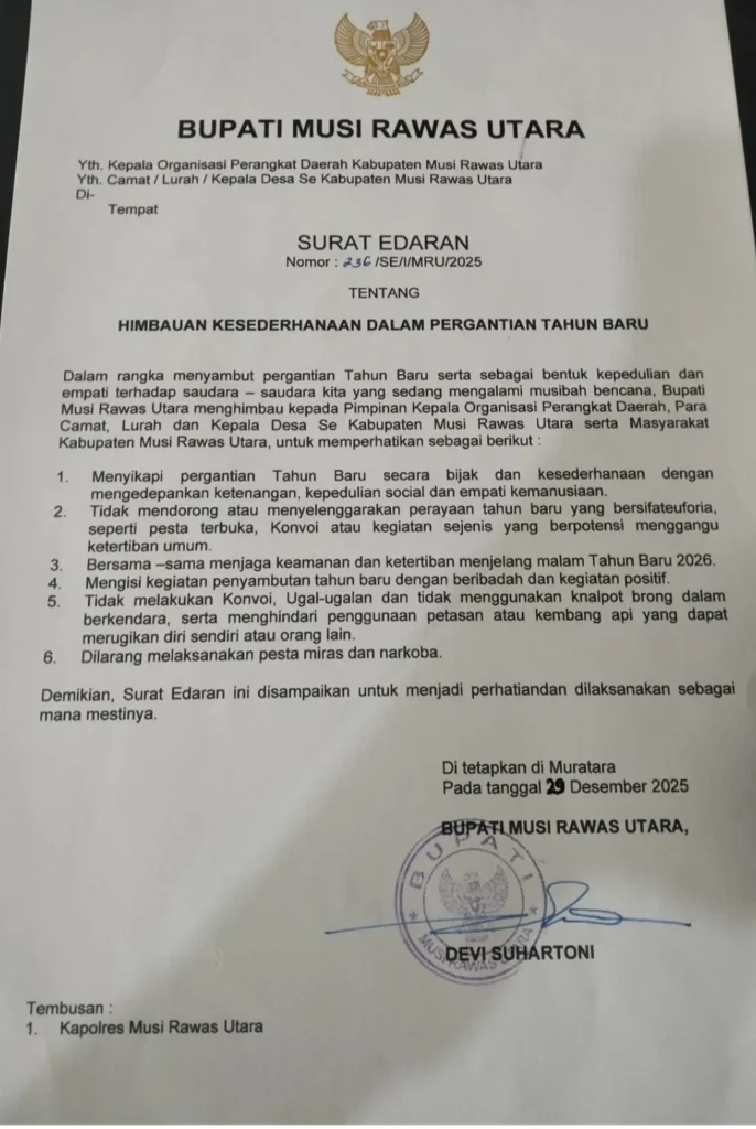 Surat edaran tertanggal 29 Desember 2025 tersebut ditujukan kepada seluruh Kepala Organisasi Perangkat Daerah (OPD), Camat, Lurah, Kepala Desa, serta masyarakat di wilayah Kabupaten Musi Rawas Utara.