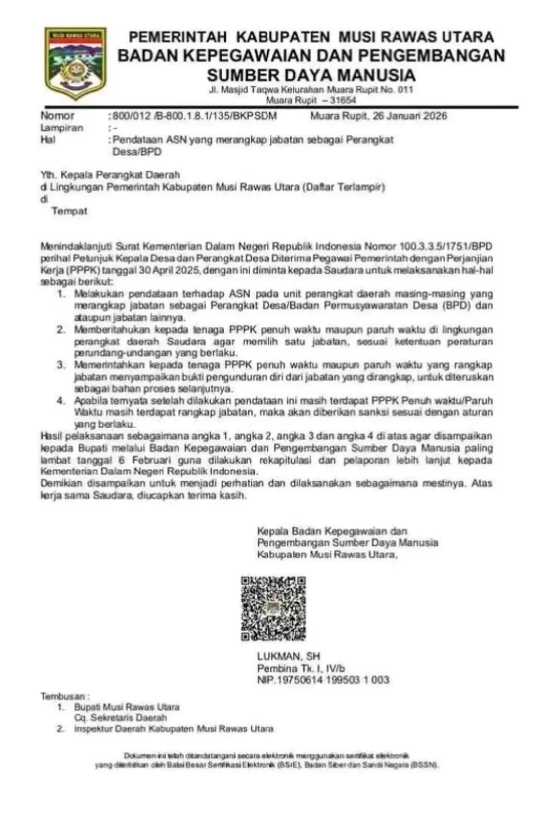 Pendataan tersebut tertuang dalam surat resmi BKPSDM Muratara tertanggal 26 Januari 2026 yang ditujukan kepada seluruh Kepala Perangkat Daerah di lingkungan Pemerintah Kabupaten Musi Rawas Utara.