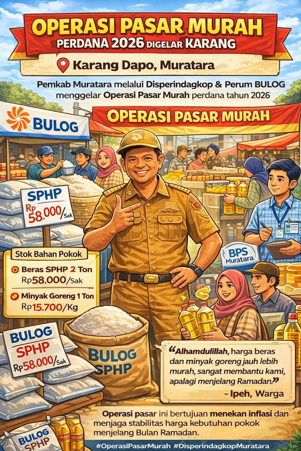 Murataraklik.com — Pemerintah Kabupaten Musi Rawas Utara (Muratara) melalui Dinas Perindustrian, Perdagangan, dan Koperasi (Disperindagkop) bekerja sama dengan Perum Bulog menggelar Operasi Pasar Murah sebagai upaya mengendalikan inflasi serta menjaga stabilitas harga bahan pokok menjelang Bulan Suci Ramadan.